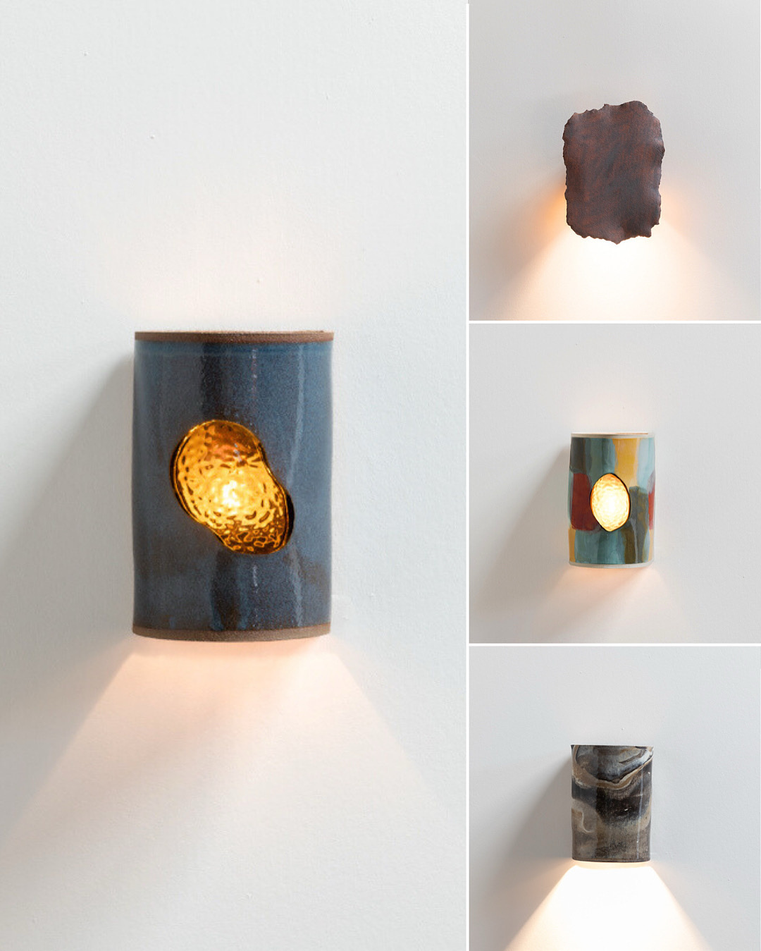 Many pieces combine ceramic and glass, allowing light to pass through and soften as it emerges. The solidity of the ceramic contrasts with the diffused glow of glass, creating depth, warmth, and a layered lighting effect.